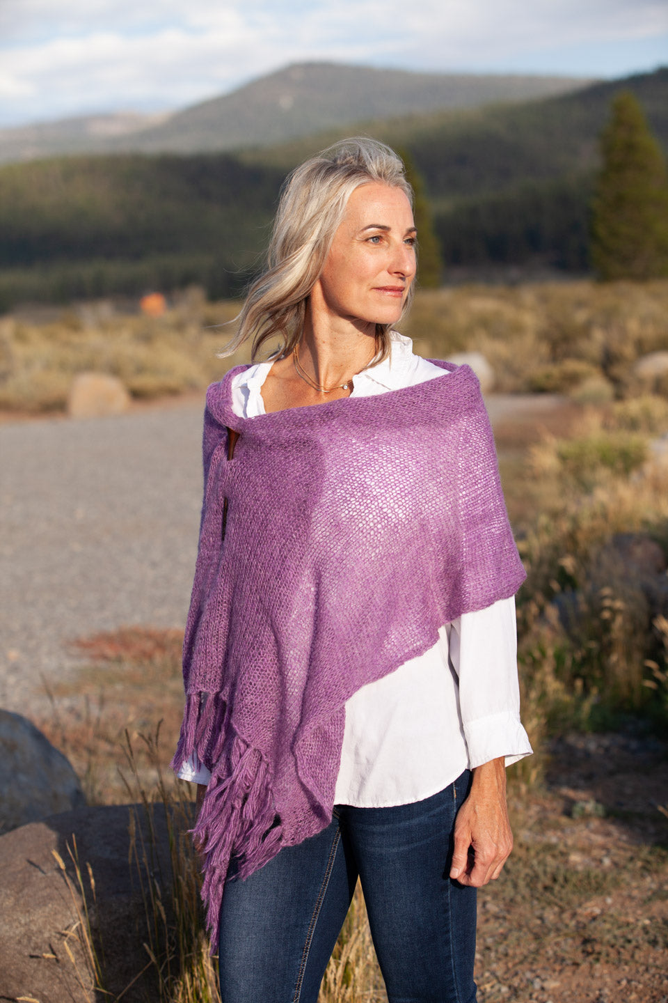 This Shawl is very versatile. Wonderful on a trip.