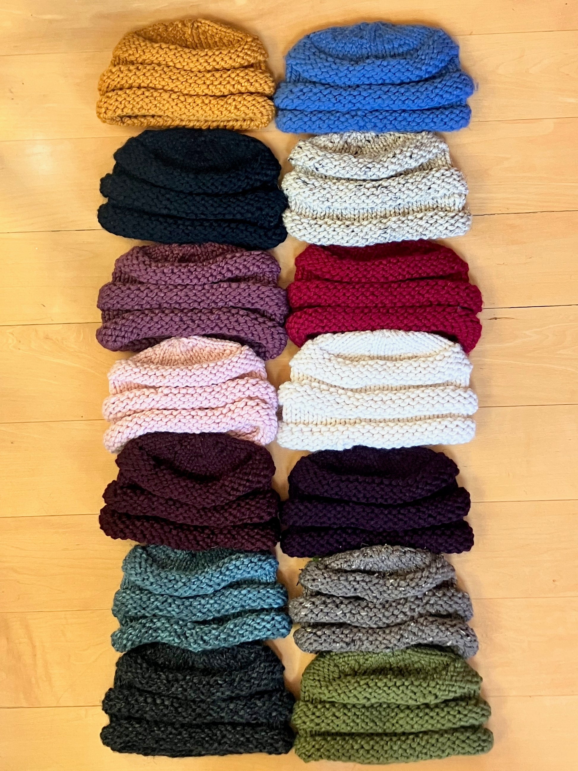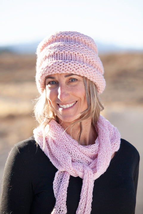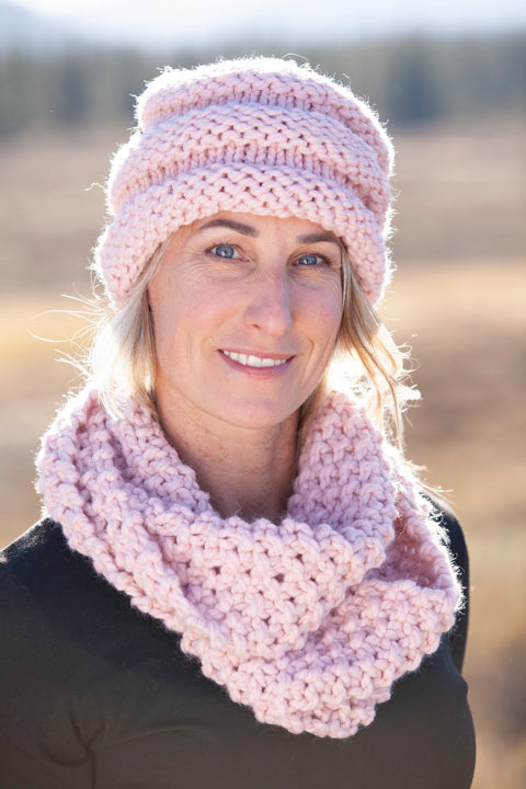 Blush Mountain Hat shown with Blush Infinity and Cashmere Petite Scarf
