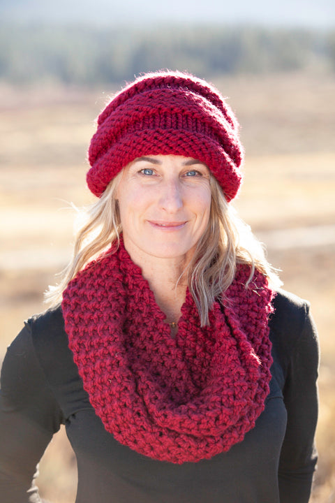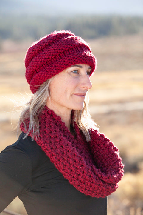 Ruby Mountain Hat shown with Ruby Infinity Scarf
