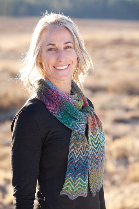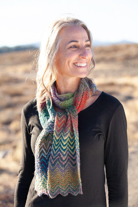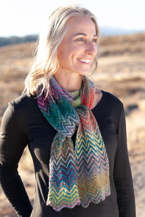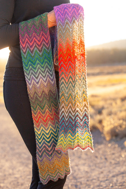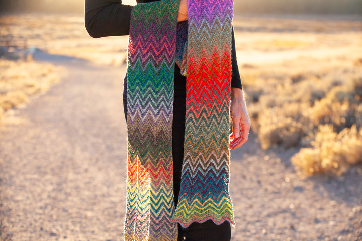The Cosmic Rainbow Scarf is made of 100% Merino wool from Germany.
